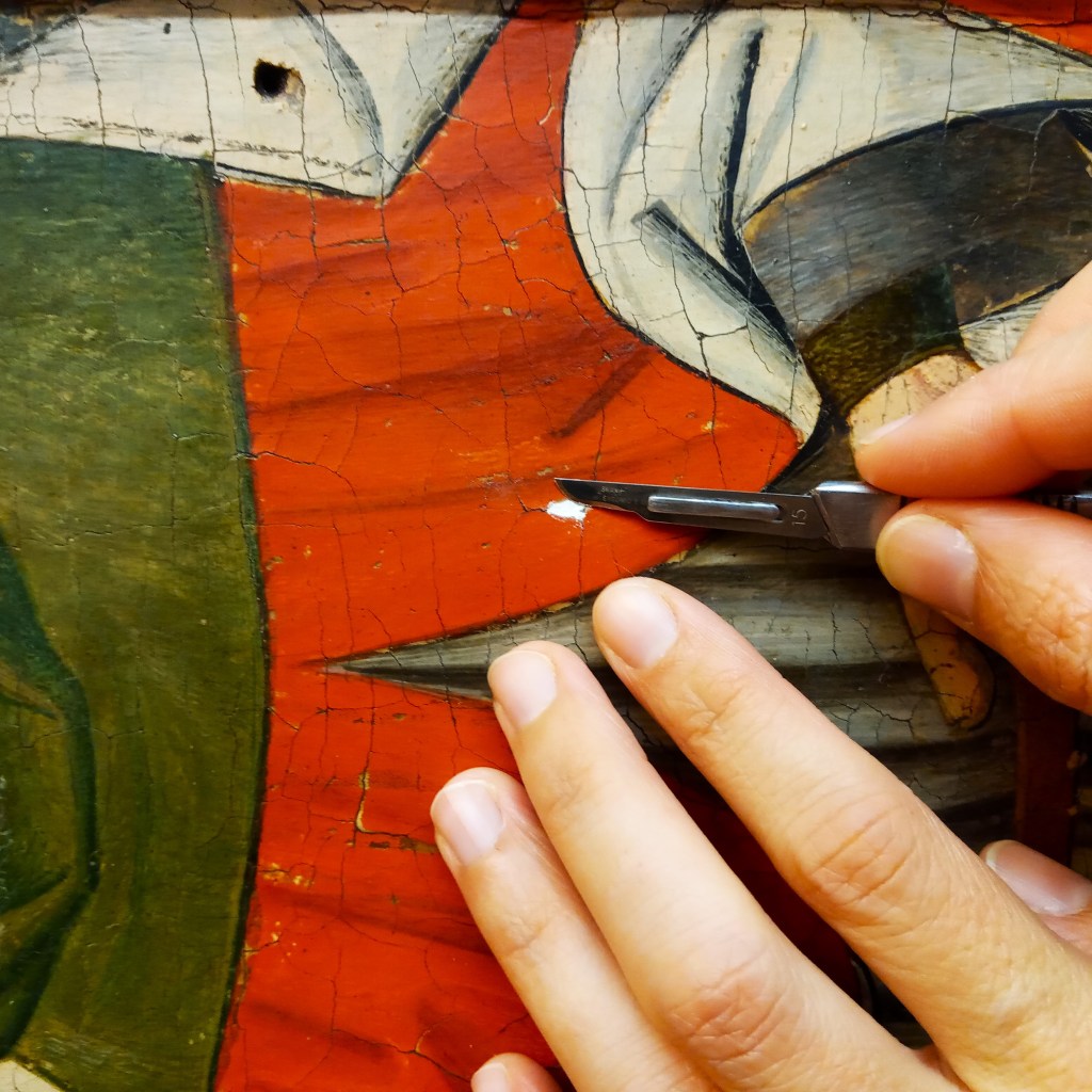 Sobre aquest suport generalment les peces que tractem són retaules medievals o pintura de cavallet sobre fusta. Habitualment pateixen problemes específics com esquerdes, despreniments, atac de xilòfags, etc. Per tal de retornar la seva estabilitat i assegurar la seva conservació, les intervencions més comunes són fixació i consolidació del suport, així com també neteges i reintegració.